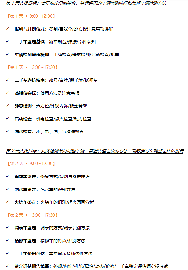 ●【技术实战班】自学网课后,在南京江宁区参加两天实操集训,全面掌握车辆鉴定评估技能,考取行业认可的技能证书。