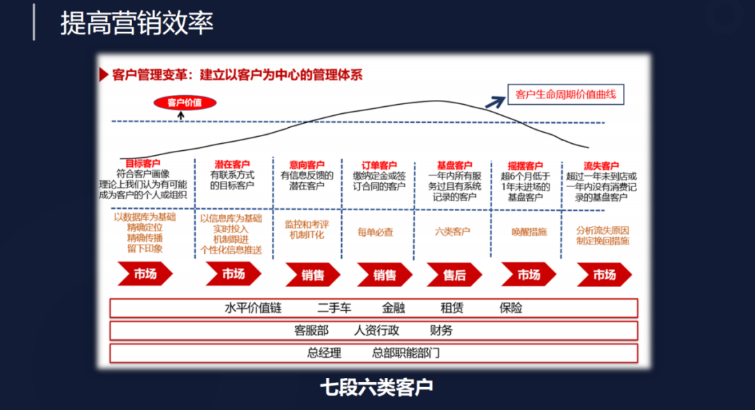 在提高营销效率方面,其中一个很重要的基础就是客户精准分类。我们的集团客户分类有13大口径,分为122项细类。对客户的管理通过时间轴分为七段客户,分别为目标客户、潜在客户、意向客户、订单客户、基盘客户、摇摆客户、流失客户。所以真正的以客户为中心,一定要从C端客户的管理上体现出来,而效率则是从客户转化率上体现出来。