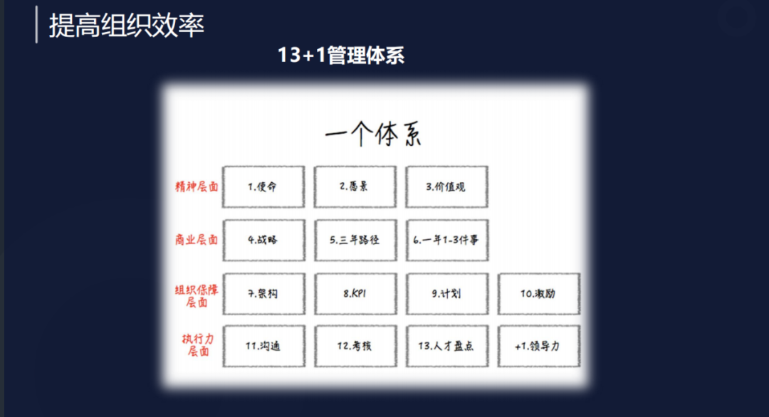 在提高组织效率方面,我认为最重要的一点就是方向和战略不能错。为什么一些大公司的决策会这么慢?我悟出一个道理,就是大公司要减少战略上的犯错,小公司要善于抓机会,这是各自的生存法则。之前我在私人董事会学习,有一位黄旭老师写了一本书叫《13+1》,其中对于公司运营等方面,分析的比较系统、透彻。